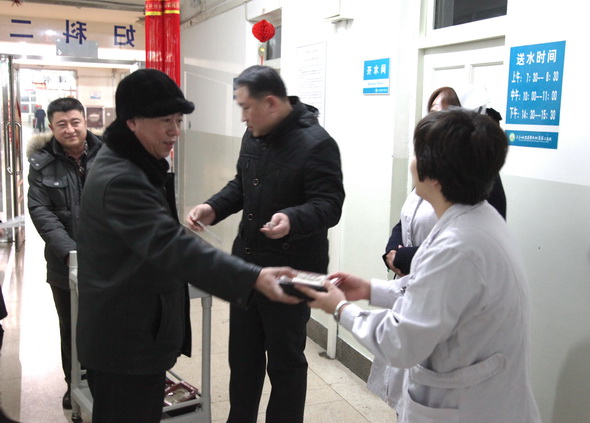 在这个全国人民欢度佳节的喜庆日子里,我院临床一线的职工不能与家人团聚,享受天伦之乐,他们坚守在救死扶伤的第一线,为病人解除病痛,为病人服务。为此,我院领导班子带领机关干部分组到各个病区,看望和慰问坚守岗位的医护人员,代表医院感谢他们的辛勤工作和无私的奉献,并向他们致以春节的问候。