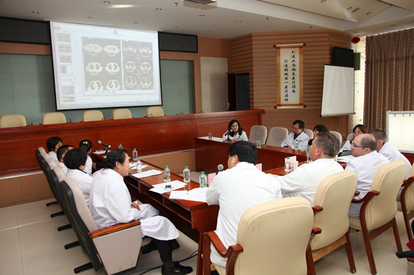 此次会诊的5位患者分别患有:左上颌窦炎性肌纤维母细胞瘤、鼻咽癌IV期右肺转移癌、食管癌小细胞癌、脾占位疑似淋巴瘤、非霍奇金淋巴瘤左肺占位疑似癌细胞转移。在与美国专家会诊之前,我院专家已将5位患者的病历翻译成英文,以幻灯片的方式做现场介绍。