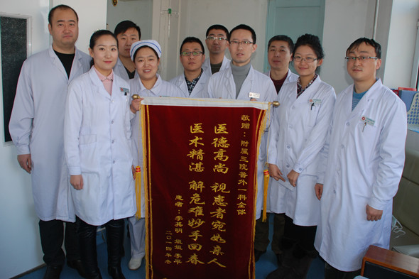 手术后的第二天,患者李其明的姐姐李平从哈尔滨赶了回来。李平说:“李其明没有儿女,没有老伴,要不是鲁主任、郝主任和多医生及时手术,后果真是不堪设想。”为了表示对普外一科全体工作人员的感激之情,李平特意委托原工作单位哈尔滨铁路局老干部管理处齐齐哈尔办公室的两位同事为普外一科全体工作人员送上锦旗一面,上书“医德高尚视患者宛如亲人、医术精湛解危难妙手回春”。