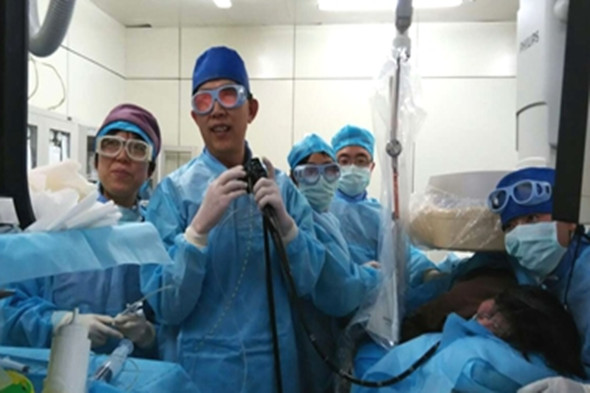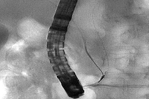 12月29日,刘琳主任和助手莫庆国医生披上厚重的铅衣进入手术间。凭着多年的穿刺插管操作经验,刘主任一针命中肝内胆管,莫大夫缓慢注入造影剂,显示屏上清晰地显现出扩张的胆总管,一个直径约1cm的结石在胆总管里浮动,大家激动起来,曙光就在眼前!导丝在刘主任的娴熟操控下沿着导管在胆总管下端上下左右探查,试图从十二指肠乳头穿出,一遍遍试探,又一遍遍失败。更换了不同型号的导丝还是无济于事,导丝要么在胆总管下端反折,要么就不可思议地从胆总管逆行进入主胰管,就是不进入十二指肠降部。多次的胰管刺激可别造成胰腺炎,刘主任和陈主任短暂商榷后决定先终止手术。手术结束后陈主任左思右想,既然导丝能进入胰管,从胰管里把导丝拽出来不就成了吗?陈主任又想接手刘主任把卷子答完。