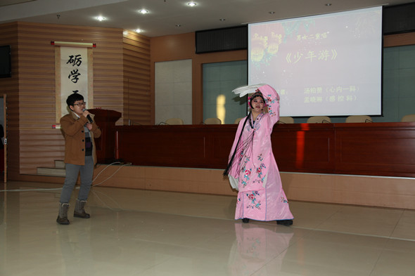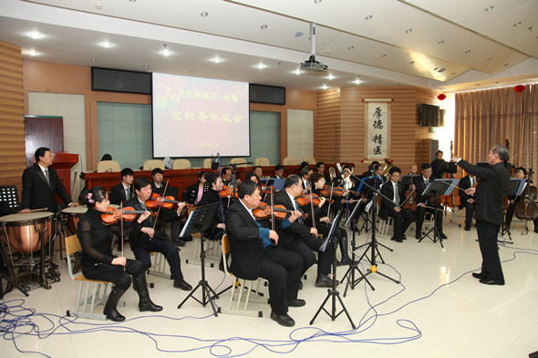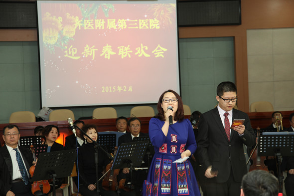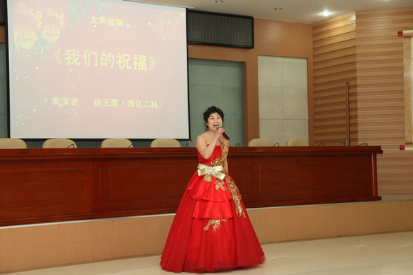 迎新春联欢会在院管弦乐团演奏的《北京喜讯到边寨》乐曲中拉开了序幕。学院副院长丛明宇和医院领导班子激情澎湃的小合唱《团结就是力量》,展示了领导班子团结一心、凝聚力量,为医院谋发展的信心和决心。呼吸二科的小品《将心比心》和普外科表演的哑剧《静点室的故事》颇具创意,获得了满堂喝彩。心内一科汤柏赞和感控科孟晓琳是对夫妻,他们演唱的《少年游》,歌声优美、扮相唯美,真心真情唱出了少年游遇陌上花,采桑子过天净沙的意境。药剂科编排的情景话剧《药师在您身边》,轻松幽默的情景,再现了临床工作者工作的点滴和辛劳。一组由财务科薛丹带来的《欢乐中国年》、办公室李进带来的《桃花谣》、放疗科赵鑫和吕春阳带来的《一个像夏天一个像秋天》的歌曲演唱,让大家精神饱满,带着新的希望去叩响新年的大门。肿瘤二科、肿瘤三科青春洋溢的爵士舞《Dr.feelgood》、体检科《附属三院版小苹果》和三轮抽取幸运观众的环节把现场的气氛推向了高潮。消化二科杨玉霞一首《我们的祝福》将联欢会带入了尾声。