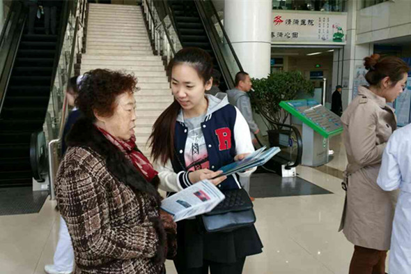 宣传科工作人员为参加义诊的患者发放宣传手册