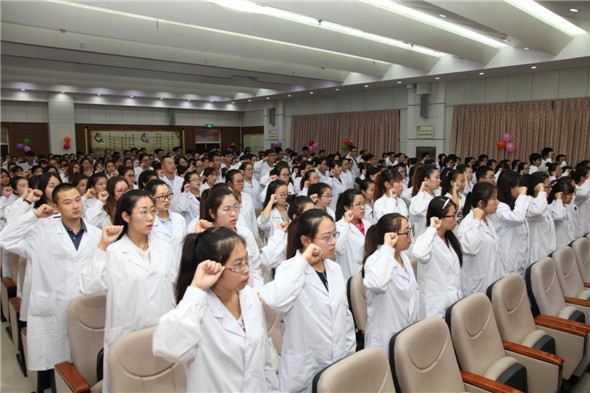 表彰结束后,外科教研室副主任、麻醉科副主任张文华、内科教研室主任、心内一科主任邵海峰分别代表全体教职工、教研室发言,他们为学生们指点迷津,鼓励学生们努力学习。2011级学生代表马榕鸽、2012级学生代表李曼琳分别发言,表达了对学校、医院、老师的感激之情,并抒发了对医学殿堂的憧憬和不辞艰辛、刻苦钻研的决心。张文华老师带领全体新生进行了医学誓言宣誓。