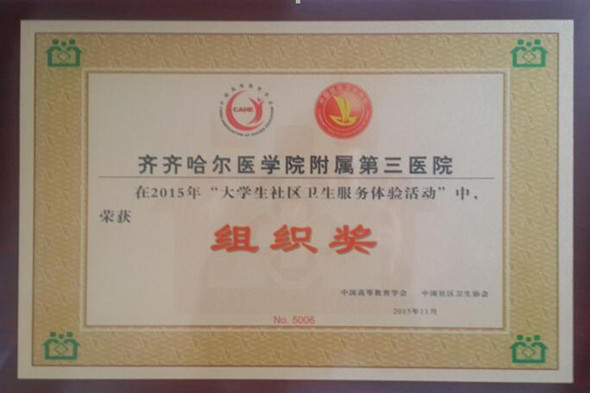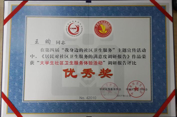 11月份,从中国社区卫生协会传来喜讯,我院2011级临床1班王昀同学获得2015年度“大学生社区卫生服务体验活动”调研报告优秀奖,我院被评为“最佳组织奖”单位。
