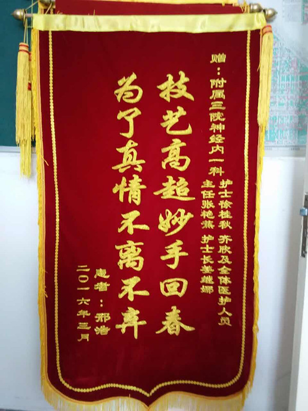 小邢康复了,4月1日是他出院的日子,他和他的父母亲手将一面写有“技艺高超妙手回春 为了真情不离不弃”的锦旗赠送给神经一科的全体医护人员,他的父亲说:“感谢科室全体医护人员这么多天对他儿子的治疗和护理,悉心照顾着他,是你们把他从死亡线上拉了回来,这种恩情我们一辈子都不会忘记”!