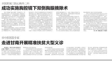 近日,附属三院心胸外二科成功为一名家住拜泉县的45岁女患者实施了胸腔镜下双侧胸腺摘除术。该例胸腔镜下完整胸腺切除,达到了国内领先水平,标志着我院的胸腔镜微创手术水平又上了一个新的台阶