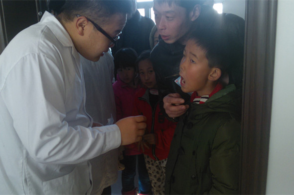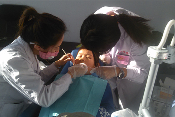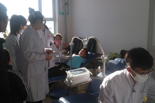 此次活动中,我院学生科辅导员杨超及口腔科关鑫博医师带领13级口腔专业的刘雨佳、田勇、栾宝东等11名同学乘车来到梅里斯区达呼店中心小学,与家长面对面沟通并讲解了各年龄段孩子的牙齿防护方法,包括正确刷牙、窝沟封闭、使用含氟牙膏、定期口腔检查等。之后老师和同学们逐一为小朋友进行了相关的口腔检查。检查中,发现孩子们的口腔卫生保持不佳,龋洞较严重。在关鑫博老师的指导下,同学们为小朋友进行了简单的窝沟封闭及龋洞充填。
