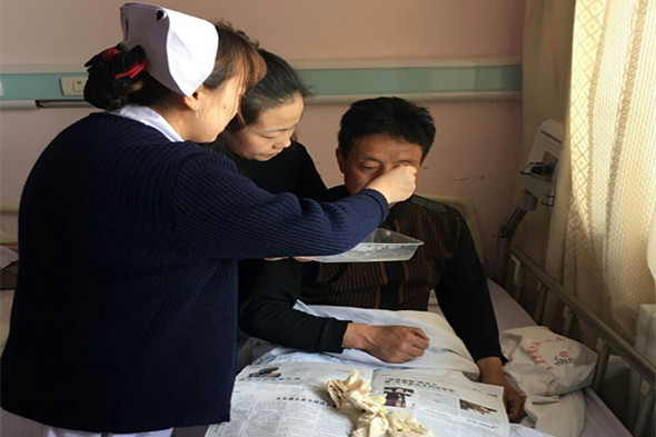 患者的救治问题解决了,但是因为病人为一侧身体偏瘫,不能行走,护理成了大问题。神经内一科的护士为其安全着想,放置护栏,以防摔倒。护士长又特殊安排了护士刘旭娟专门看护这名患者。因为患者从发病到病房经历了几个小时没有吃饭,护士把中午自己定的包子拿给患者吃,由于患者发病很急,吞咽功能有些受累,不能正常吃饭,吃急了就会呛咳,护士刘旭娟非常有耐心,一口一口地喂,站在那里保持着一个姿势,患者吃掉一个包子用了15分钟,刘旭娟就一个姿势站了15分钟。患者口渴了,就及时喂他喝水,护士时时刻刻关注着患者的身体情况,事无巨细的照顾着患者的饮食起居。