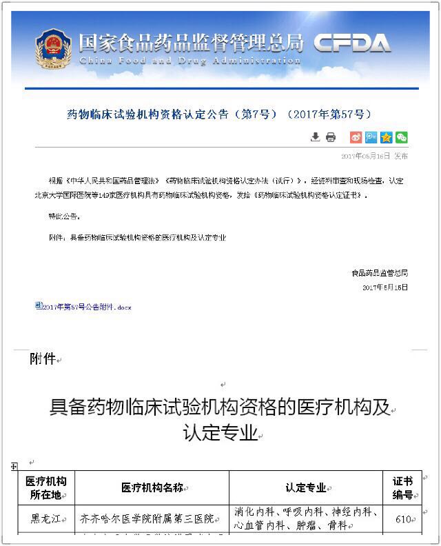 2017年5月15日,国家食品药品监督管理总局向我院颁发了《药物临床试验机构资格认定证书》,消化内科、呼吸内科、神经内科、心血管内科、肿瘤、骨科六个专业取得了承担药物临床试验的资格。国家药物临床试验机构资格认定证书的获得是我院医疗水平和科研能力的综合体现。