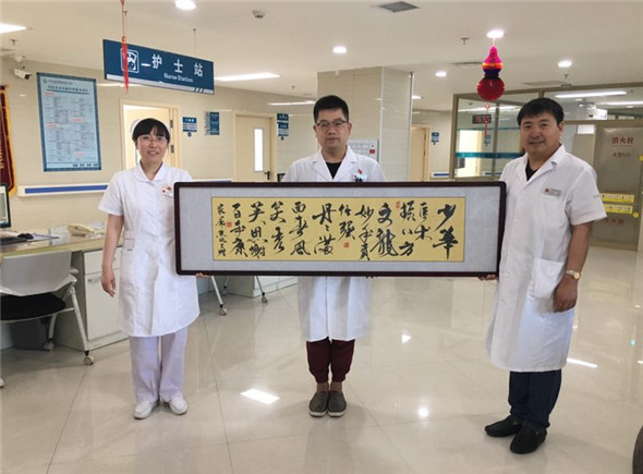 近日,患者家属将一副裱好的书法字画,上面写着:“少华医术振八方,文龙妙手责任强,丹丹满面春风笑,秀英恩谢百年康”送到了附属三院骨外二科。无疑是对我科医疗与护理质量莫大的认可。