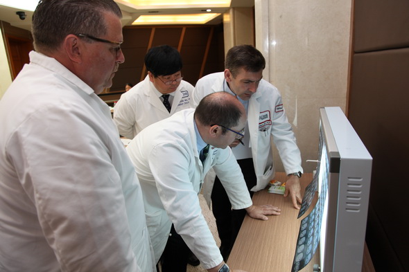 出诊中,专家们详细询问病人的病史、查看病例、CT、病理等相关资料,分析病情,研究诊断,确定治疗方案,针对肿瘤诊治的热点、难点充分讨论,为患者制定出与国际接轨的个性化治疗方案。一位患者肩部疼痛难忍发现病情十余天,经详细检查、询问后,美国专家给出的建议是:放射治疗,勿拖延时间,治疗后肿瘤缩小有手术机会,并且结合靶向治疗;一位有20年肝癌史的患者,近一个月出现胸腔积液,抽取2次积液,做6次病理检查未查到癌细胞,患者本人不愿做有创治疗。美国专家给出的建议是:“胸膜固定术”,可减轻疼痛和积液的复发,也可顺便取出活性组织进行活检,确诊后进行下一步治疗。