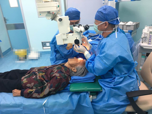 主任邢立臣与副主任崔哲为老人进行超声乳化联合人工晶体植入术