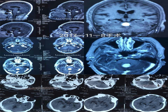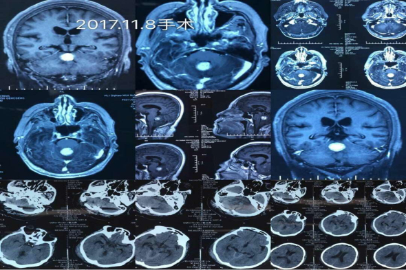 患者徐某,63岁,3周前老人突然出现站立不稳,走路向一侧偏斜,并有头晕不适等症状,家人立即带老人到当地医院就诊,以脑血管病对症治疗,但是症状不见好转。之后慕名来到我院入住神经外二科,经过一系列的CT、核磁检查,在脑干、小脑蚓部发现了一处占位性病变,脑桥粘连并明显受压,随时有生命危险。而且患者的肿瘤位于脑干、位置深,稍有不慎即可造成致死致残,手术风险极高。经过完善的术前准备后,11月8日,在科室主任吴卫东的带领下进行手术,无影灯下,生命禁区,手术刀在世界上最精密、最复杂的脑干神经网中精准游走,丝毫不差,采用后正中入路,在显微镜下有条不紊的分离、切开小脑蚓部,保护桥脑、仔细分离、逐块完全切除肿瘤,手术非常成功。术后患者意识清醒,无偏瘫失语、面瘫及共济失调等并发症,目前患者恢复良好。