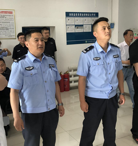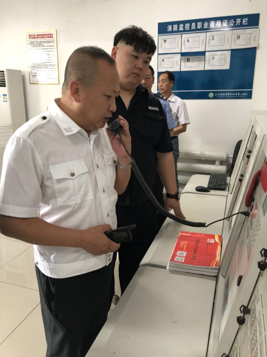 保卫科科长刘军使用消防广播向各楼层宣布演练开始
