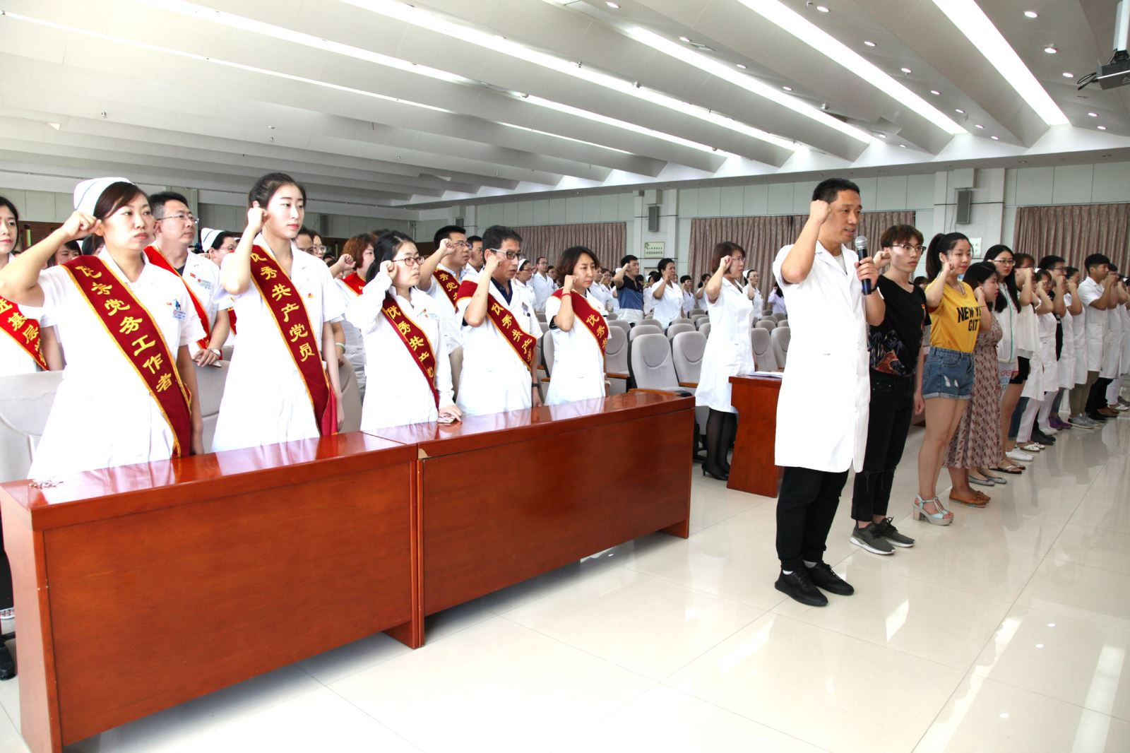 大会在嘹亮的国歌声中开始。会上,由党委办公室科员曹先保领誓,预备党员及全体正式党员面向党旗进行了入党宣誓及重温入党誓词。铿锵有力的宣誓声在鲜红的党旗映衬下响彻会场,展现出附属三院广大党员不忘初心,牢记使命,为实现中华民族伟大复兴的中国梦不懈奋斗的坚定决心。