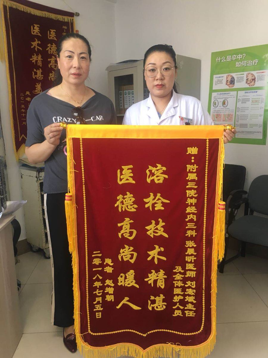 近日,我院神经内三科成功溶栓一名急性脑卒中患者,溶栓过程仅1个小时,患者家属为表示感谢,为科室送去一面印有“溶栓技术精湛 医德高尚暖人”的锦旗。