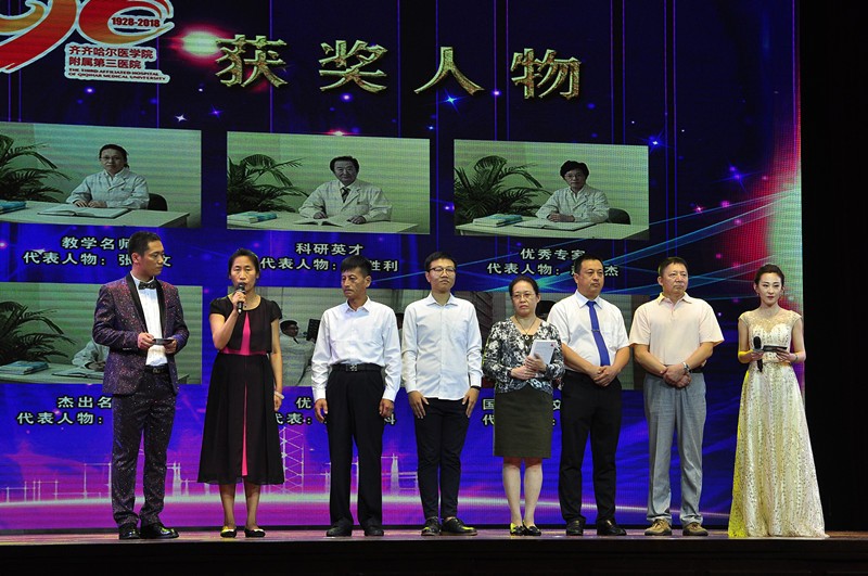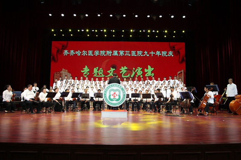 为庆祝建院90华诞,表彰先进典型,激励全院职工凝心聚力、共谋发展,在全院弘扬“敬佑生命、救死扶伤、甘于奉献、大爱无疆”的新时代医疗卫生职业精神,8月31日下午,“不忘初心,牢记使命”齐齐哈尔医学院附属第三医院建院90周年颁奖典礼暨文艺演出在工人文化宫剧场欢乐唱响。齐齐哈尔市卫生和计划生育委员会主任刘锋、市科学技术协会副主席刁齐龙、市科技局副局长王海坤、市人力资源和社会保障局副局长赵峰、市社会医疗保险局总稽核师张英利、哈尔滨铁路局齐齐哈尔铁路医保分中心主任陶伟光、市科学技术协会学会部孙秀英、市医学会会长韩志宏、齐齐哈尔医学院党委书记 刘吉成、齐齐哈尔医学院副院长王晓星、齐齐哈尔医学院副院长张晓杰、齐齐哈尔医学院纪委书记毕红霞、齐齐哈尔医学院工会主席何宪坤、齐齐哈尔医学院医院管理处处长张嘉伟以及齐齐哈尔医学院附属第一、第二医院,讷河市、富裕县、泰来县、龙江县、克山县、甘南县、拜泉县、依安县、克东县、梅里斯、大兴安岭地区、黑河嫩江县、大庆林甸县、大庆市杜尔伯特、九三农垦总局、内蒙古自治区扎兰屯市、内蒙古自治区阿荣旗、内蒙古自治区莫旗、内蒙古自治区扎赉特旗等地的医疗保险管理局、卫生和计划生育委员会、人力资源和社会保障局、医疗卫生系统嘉宾,以及附属三院历届老领导、离退休荣誉职工和附属三院全体干部职工欢聚一堂,共同祝福附属三院生日快乐、星耀未来。