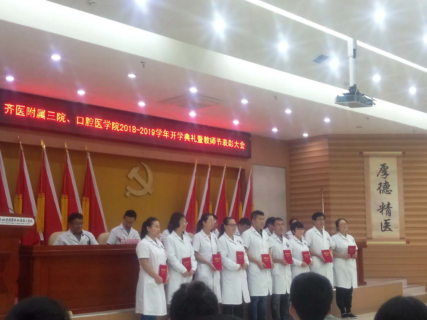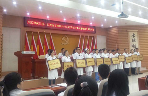 大会由李玉雪书记主持。为了鼓励教师积极投身教学事业,提升教学质量,我院不断出台政策加大对教学经费的投入,积极奖励在教学工作中贡献突出的人员。本次教师节共表彰先进集体13个,优秀教学管理干部18人,优秀授课教师21人,优秀带教教师21人,获教学查房、教案书写、及理论授课竞赛奖励的共计35人,大会同时奖励了在寝室文化建设中表现突出的学生集体。颁奖结束后,分别由学生代表及教师代表发言。学生代表慷慨激昂地抒发了大家对三附院学习生活的热爱,并表达了对教师们的祝福。外科教研室主任田少华教授在发表热情洋溢讲话的同时对新生也提出了殷切希望,并带领全体新生进行了庄严的医学生誓言宣誓。
