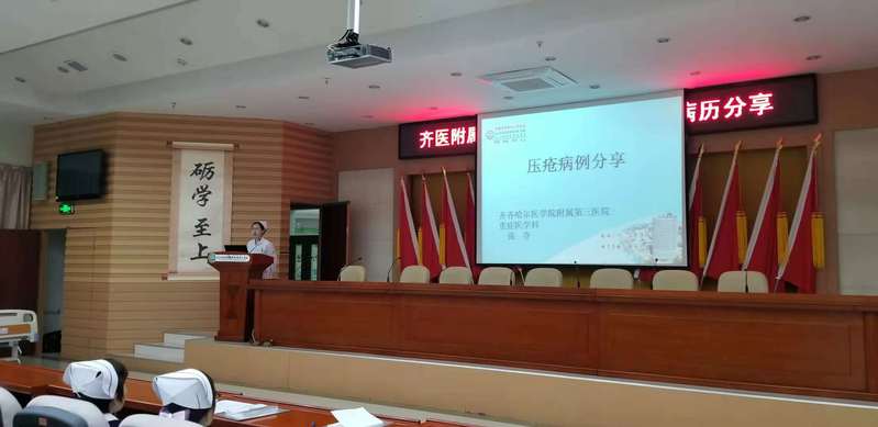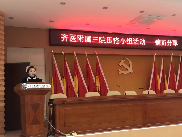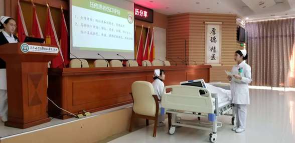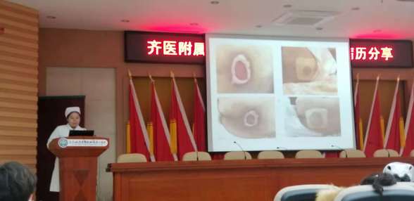 会议首先由神经内一科护士丛李、重症医学科护士张夺、内分泌一科护士刘丹与参会人员分享在临床搜集的压力性损伤患者治疗过程的典型病例,三位护理人员精心筹备、课件内容丰富、案例鲜明。随后,神经内一科护士林丽对2期压力性损伤患者的换药流程进行演示。护理部副主任马琳发表讲话,她对此次活动给予高度评价,希望护理人员发挥专业特长,掌握前沿的护理新理念,为压力性损伤患者提供更好的护理。