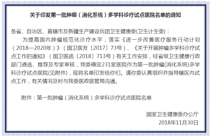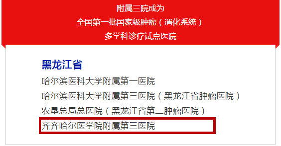 国家卫生健康委办公厅于2018年11月30日公布名单,确定全国231家医院作为第一批肿瘤(消化系统)多学科诊疗试点医院,其中黑龙江省有4家医院入选,齐齐哈尔市仅附属三院一家入选。