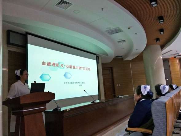 血液净化专场汇报由血液净化专科护士、血透室护士长刘阳进行关于《血液透析及“动静脉内瘘”的原理》的讲座,刘阳护士长将血透原理、动静脉内瘘术等通过生动的图片展示,以科普方式进行宣教,通俗易懂。讲座中,她将自己在国家级专科护士培训班中学习的感受分享给大家,她说:“当看到一位尿毒症患者抗击疾病,坚持血透43年的病例时,我想一定要把这个病例带回去!告诉我的患者,在抗击疾病的路上,我们永远在一起!在培训中我深刻体会到在工作中给患者多一些信心、多一些关爱、换位思考是多么的重要”。