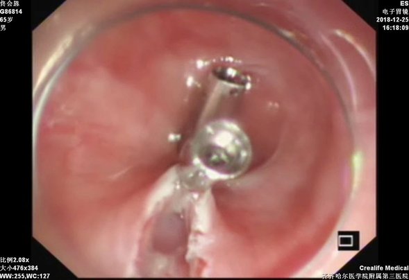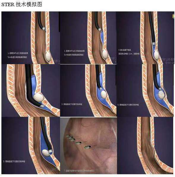 STER(内镜经黏膜下隧道肿瘤切除术)手术是内镜微创治疗领域最为前沿的技术之一,属于四级消化内镜诊疗技术。即在距离肿瘤口侧3-5厘米建立粘膜下隧道,逐渐显露肿瘤,肿瘤显露以后沿肿瘤包膜在内镜直视下剥离,完整剥离后,取出肿瘤,用金属夹闭合隧道口。该方法可一次性完整剥离绝大多数来源于固有肌层的粘膜下肿瘤,同时保持消化道粘膜的完整性,即使出现穿孔,也可以非常快速轻易闭合隧道,有效防止气体以及消化液外漏。相对于既往的切除方式ESD,该手术方式不但可以避免术后出现消化道瘘和胸腹腔感染,而且手术创面小,恢复较快,住院时间缩短和减少了医疗费用,充分体现了微创的优越性。