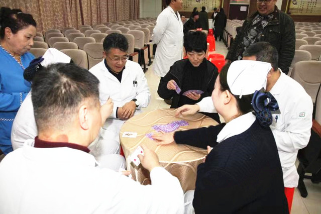 新春佳节即将到来,为丰富职工文化生活,缓解职工工作压力,愉悦身心,增进职工的沟通与友谊,院工会于2月1日和2日下午,在医院门诊四楼多功能厅举办了迎新春职工扑克对抗赛。此次活动以工会支会为单位组队,每个支会选派3支队伍(每队3人)组成一个团队,比赛设为单循环赛: 共8支团队——分别是外科一、外科二、内科一、内科二、门诊、联合一、联合二、口腔和肿瘤分院。胜队得2分,输队得1分,弃权0分。最后以积分多少排名次。如果积分相同先看胜负关系,再查胜负的小分。