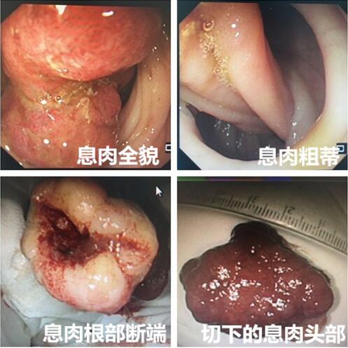 好几双眼镜都紧紧盯着屏幕,观察着息肉颜色的变化,尼龙圈释放出来的时候,大家仿佛打赢了一场前哨战,既信心倍增,又稳扎稳打,在尼龙环下方用2枚金属夹夹闭根部,接下来就是发起冲锋的时刻啦!在双重保险下,挥刀对“毒瘤”,高频电刀在弯曲的“人肠小道”缝隙中绕进息肉根部,既要避开尼龙圈,又要保证完整切除,屏气凝神中,电刀被踩下发生的每一次嘀嘀声,都仿佛战场上杀敌的呐喊,在电刀切凝模式不断交替中,息肉终于离体——战败投降。粗大的根蒂残端直径近1cm,清晰的血管断端显示着这场战斗的艰难。