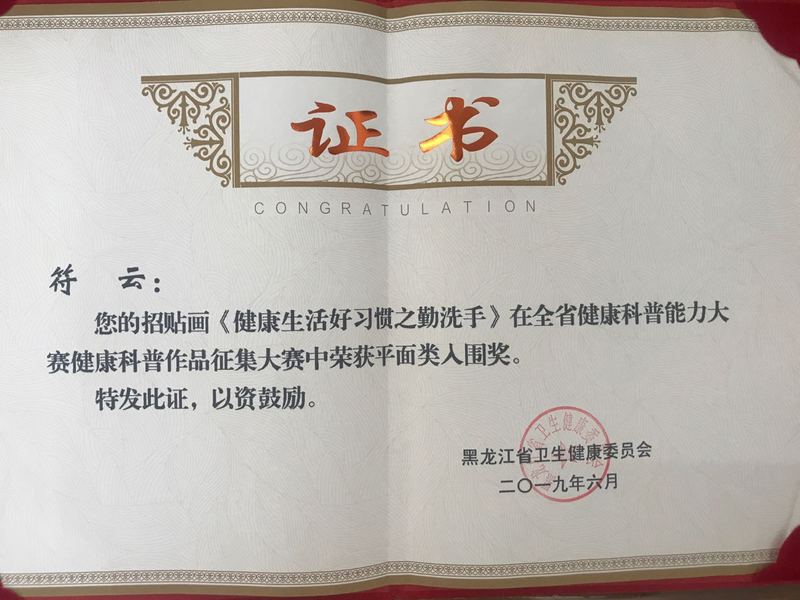 由感控科符云制作的招贴画作品《健康生活好习惯之勤洗手》和宣传科车琳制作的招贴画作品《膝关节置换术后锻炼》荣获省健康科普能力大赛健康作品征集大赛平面类入围奖。