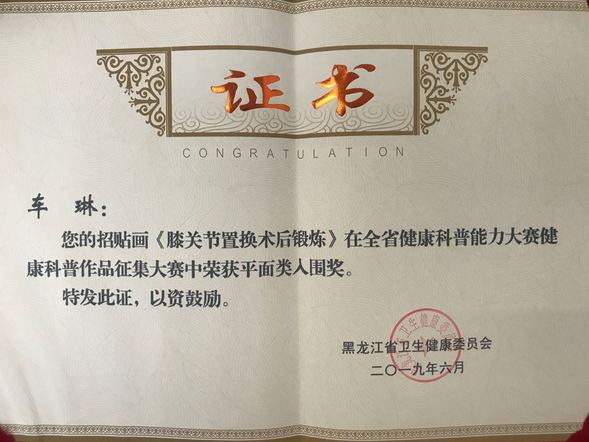 宣传科车琳的招贴画作品《膝关节置换术后锻炼》荣获省健康科普能力大赛健康作品征集大赛平面类入围奖