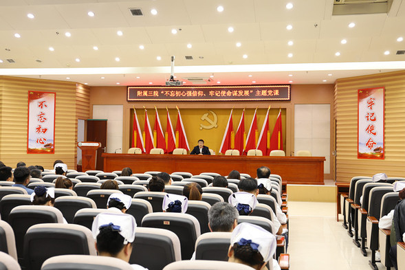 为庆祝新中国成立70周年,深入贯彻党的十九大精神,提高党员政治素养,进一步坚定理想信念,按照学院开展“不忘初心、牢记使命”主题教育的部署要求,9月29日下午,我院党委书记李玉雪在门诊综合楼四楼多功能厅以《不忘初心强信仰、牢记使命谋发展》为主题,为全院党员上了一堂生动的党课。