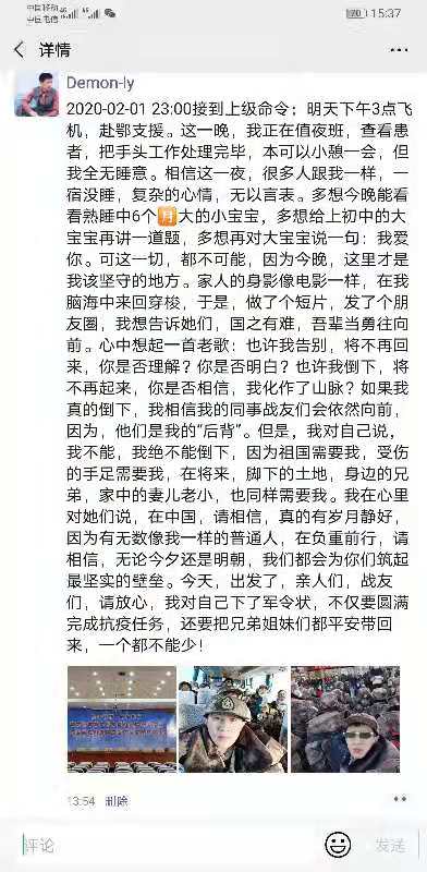 杨磊在微信朋友圈这样写道:2020年2月1日 23:00接到上级命令,明天下午3点飞机,赴鄂支援。这一晚,我正在值夜班,查看患者,把手头工作处理完毕,本可以小憩一会,但我全无睡意。相信这一夜,很多人跟我一样,一宿没睡,复杂的心情,无以言表。多想今晚能看看熟睡中6个月大的小宝宝,多想给上初中的大宝宝再讲一道题,多想再对大宝宝说一句:我爱你。可这一切,都不可能,因为今晚,这里才是我该坚守的地方。家人的身影像电影一样,在我脑海中来回穿梭,于是,做了个短片,发了个朋友圈,我想告诉她们,国之有难,吾辈当勇往向前。心中想起一首老歌:也许我告别,将不再回来,你是否理解?你是否明白?也许我倒下,将不再起来,你是否相信,我化作了山脉?如果我真的倒下,我相信我的同事战友们会依然向前,因为,他们是我的“后背”。但是,我对自己说,我不能,我绝不能倒下,因为祖国需要我,受伤的手足需要我,在将来,脚下的土地,身边的兄弟,家中的妻儿老小,也同样需要我。我在心里对她们说,在中国,请相信,真的有岁月静好,因为有无数像我一样的普通人,在负重前行,请相信,无论今夕还是明朝,我们都会为你们筑起最坚实的壁垒。今天,出发了,亲人们,战友们,请放心,我对自己下了军令状,不仅要圆满完成抗疫任务,还要把兄弟姐妹们都平安带回来,一个都不能少!”