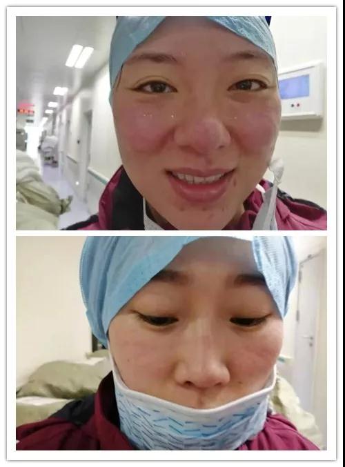 王琳(上图)和邸秀莹(下图)这两位90后,在病房工作四个小时下班后,脱下厚重的防护服、摘下护目镜和口罩的她们,脸上已经勒出了深深的血痕却依旧笑容绽放,好样的!