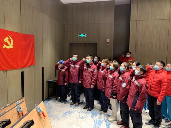 我院临时党支部在武汉协和医院西区召开第一次党支部大会,让党旗高高飘扬在疫情防控第一线。