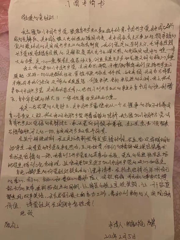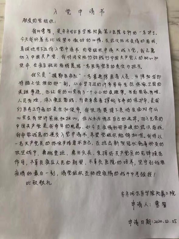 自医疗队到达武汉后,附属三院党员们不畏病毒,深入一线的优良作风,激发了其他医护人员加入党组织的信念和决心。截止目前,附属三院援助武汉医疗队中已有30人向临时党支部递交了入党申请。相信在其他党员同志的带领下,在抗击疫情一线的考验下,他们定会为党旗增色,让党徽闪耀。