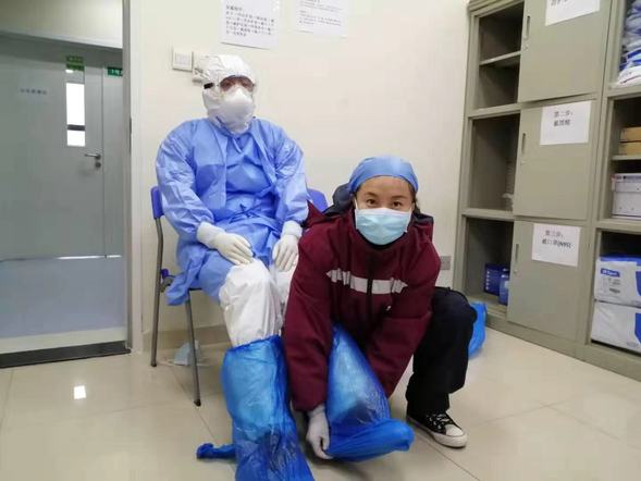 由于队友穿了多层的隔离服,不方便穿鞋套,为了防止隔离服破损,刘洁琼(右一)帮助队友穿鞋套。