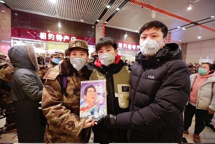 这是出发前,一家三口在齐齐哈尔飞机场的合影。刘洁琼的老公用绘画的方式为自己的爱人加油!为奋斗在抗疫一线的兄弟姐妹们助威!
