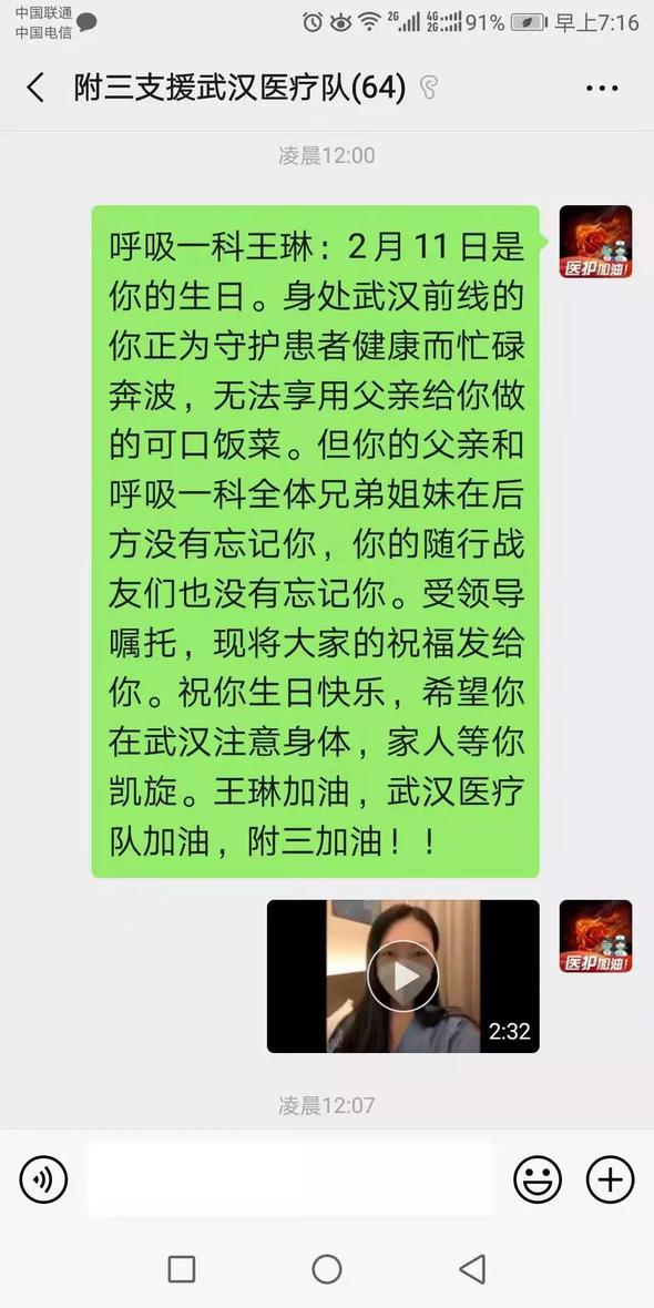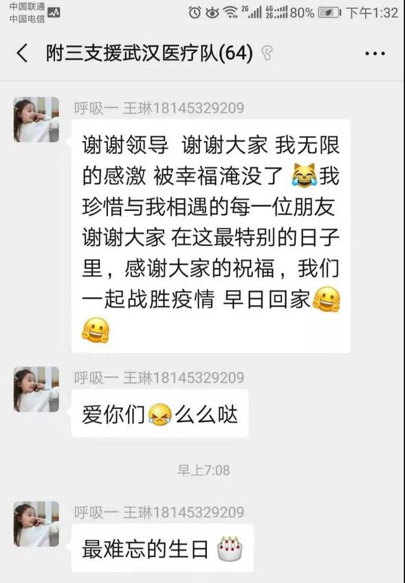 2月11日,是王琳27岁的生日。当得知这一情况后,按照医院领导的要求,党办为王琳策划了一场不同寻常的“战地生日”。医疗队队员们、呼吸与危重症医学科一病区全体同志以及王琳父亲纷纷录制视频,通过屏幕将祝福送到远在武汉的她,祝她生日快乐,希望她早日平安归来。看到这些,王琳表示由于身在疫情前线,这个生日显得尤为特别,也会让她对这个27岁“战地生日”终生难忘。她说,我珍惜与我相遇的每一位朋友,谢谢大家。在这最特别的日子里,感谢大家的祝福,我们一起战胜疫情,早日回家。当问及生日吃些什么、如何过生日时,她说,疫情面前,今天没有什么特别的,吃些盒饭,晚上九点到凌晨一点还要和另外一名队员去护理20多名患者。等回去我爸爸和科里同事会给我补过生日的,嘻嘻。