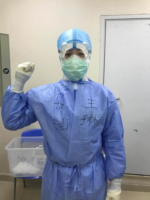 2月2日,王琳跟随“大部队”一同前往武汉,共同抗击病毒。在武汉的一周多时间里,王琳听从指挥,服从安排,穿着防护服,带着面罩和护目镜在病区工作数小时,没有怨言,没有退缩。