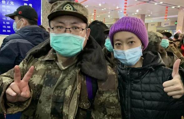 姜云飞出征武汉时,在机场与爱人蔺菲的合影