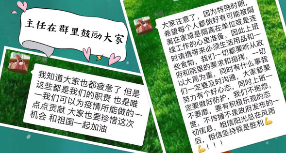 1月27日,正当疫情蔓延的严峻时刻,院领导提出倡议,奔赴武汉援助疫区。主任和护士长第一时间请缨出征,为社区全体医护人员率先垂范。榜样的力量无穷大,其他医护都纷纷请战。哪里有危险哪里到,其后她俩又身先士卒,加入到隔离点监控的任务中来,履行着医生的职责,践行着护士的使命。