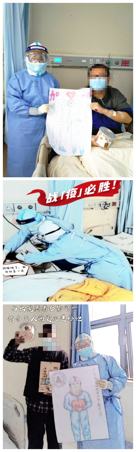 今天进舱,我就将我们队员张子英的手绘画送给整个病房的患者。一幅是给在院的患者加油鼓劲、一幅是给出院患者送祝福。为了让患者增强体质打发无聊时间,在我们领队的协调下,我们向病区内投入了可治“百病”的艾灸治疗仪,既可辅助他们治好新冠,还可帮他们治疗其他疾病。在给一位女士理疗初,她说自己没有什么病不太需要,可是当理疗结束后,她说,好舒服,改口道:“让我在这里灸一天我都愿意”。前后的对比,我们觉得我们的良苦用心达到了。