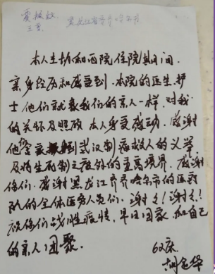 在病房遇到很多感动的瞬间,我们说着东北口音,大爷“啥事啊,饭趁热吃奥,我帮你剥鸡蛋啊……”大爷很感动说,听你们说话就觉得亲切,你们都是英雄啊,都是冒着生命危险来救我们的,竖起大拇指说谢谢!患者的肯定让我感到浑身充满力量,所有辛苦都值得。