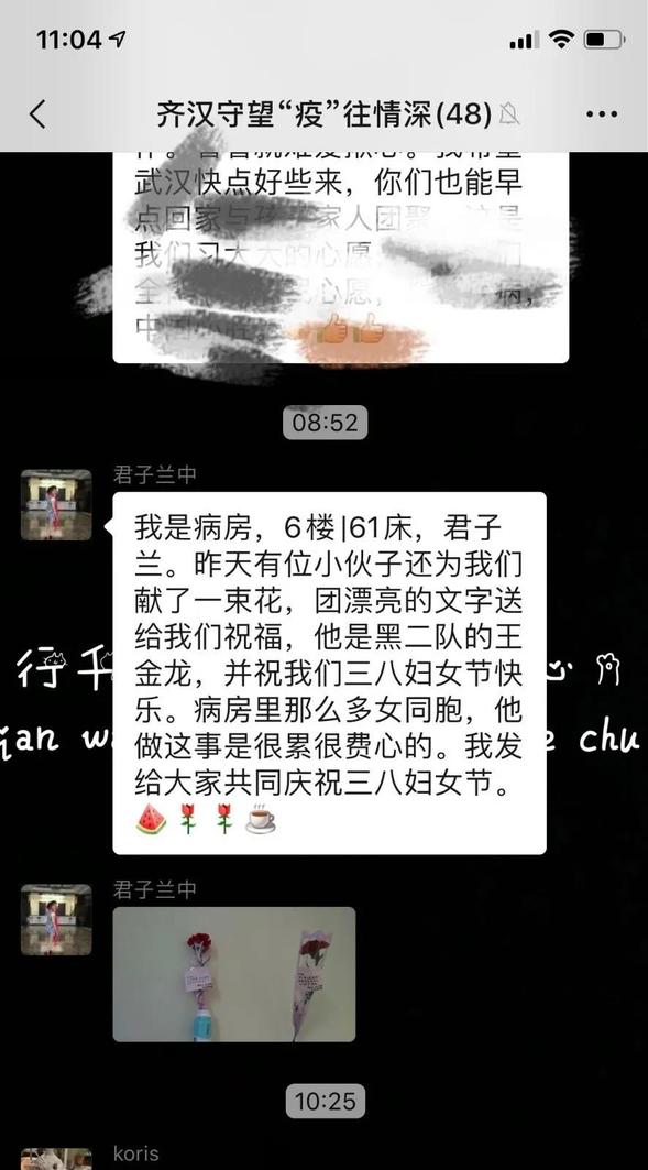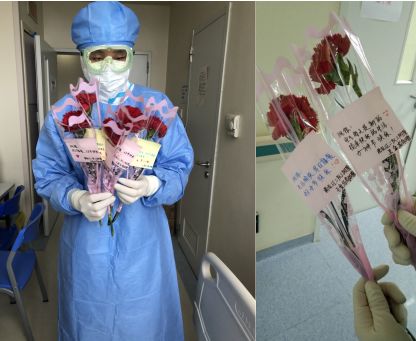 在三八妇女节即将来临之际,我院援助武汉医疗队队员王金龙在忙碌的工作间歇,跑了多家花店买花,将百余朵康乃馨献给女性患者和战友们,并手写祝福为她们树立战胜疾病的信心和勇气,让芬芳与暖意弥漫病房。王金龙在日记中这样写道,“今年不能陪在妈妈身边了。但是,这里还有很多的妈妈,他们的儿女也不在身边,希望我能尽自己的一份力,可以给她们带去温暖。今天,我为所有的妈妈买了康乃馨,从来都没给妈妈买过,在这个特殊的时期里,希望看到她们与妈妈一样展露最美的笑容,把没给予妈妈的,送给了她们。”