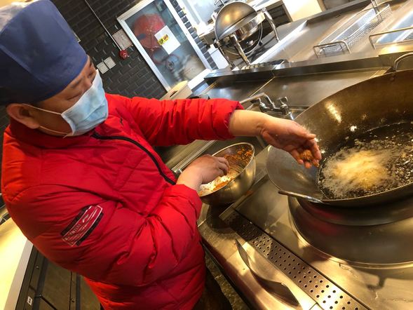 医疗队副队长刘旭之、我院呼吸与危重症医学科三病区主任刘旭之用饺子馅为医疗队员们炸了美味可口的肉丸