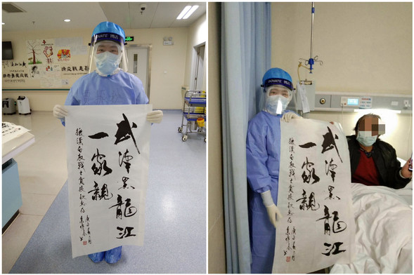昨天我是晚上八点半的班,刚到病房,我就去找到了那位会写书法老师,上次麻烦老师帮我写的毛笔字,今天看到的时候,心情非常激动,老师写的是“武汉黑龙江一家亲”“援鄂白衣战士贾振秋惠存”老师年纪已经很大了,但是毛笔字写的非常有力,我们互相道谢,愿老人家早日康复,身体健康,尽早出院。