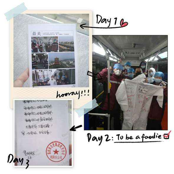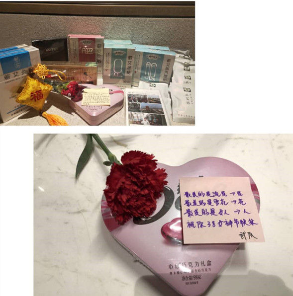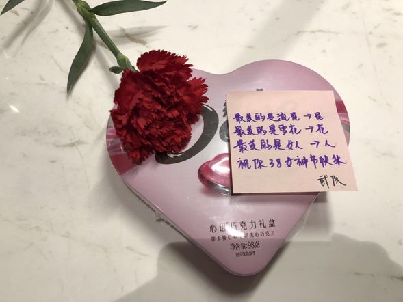 14:30我来到酒店的餐厅,与领导队友们一起包家乡的猪肉葱花大水饺。由于来到这边已有一个多月了,真的很想念家乡的味道,所以大家都包得特别起劲儿。我的第一波惊喜也在吃到包着糖果的水饺中甜蜜度过了。17:30刚回到房间,我就收到了我的第二波惊喜,是武院长为我们准备的巧克力和队友的鲜花以及政府为我们准备的礼品。此时的我,内心真的是无比的温暖与感动。回首来武汉的这段日子,我们过的每一个节日都是这样被温暖包围着的。时间转眼来到了20:30,我到达了医院,进入了隔离病区,刚一走进病房,患者们就纷纷为我们送上祝福。一声声节日快乐,一声声感谢,一声声你们辛苦了,让我觉得我所有的辛苦都是值得的,我的第三波惊喜就这样的来到了我身边。02:15,我们的班车将我们送回酒店,就当我们要下车时,我的第四波惊喜来临了,公交车队的经理为我们送上了节日的祝福和明信片,这样的举动瞬间消灭了我所有的疲惫,也让我真真切切地感受到了这个社会的大爱小爱,这样的女神节令我此生难忘。