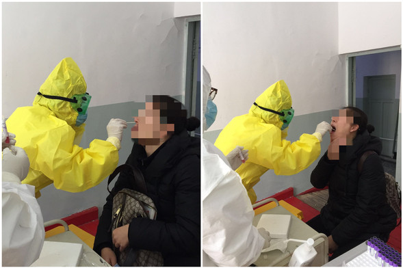 护士长杨丽侠亲自采集标本,为护士们示范鼻咽拭子采集过程。