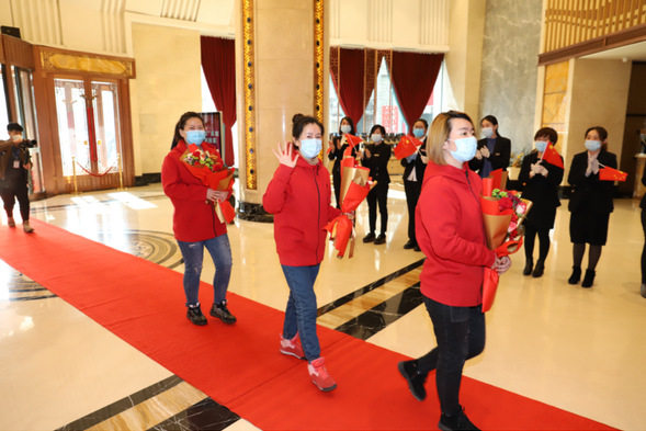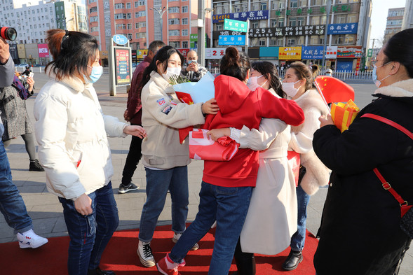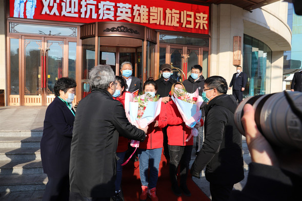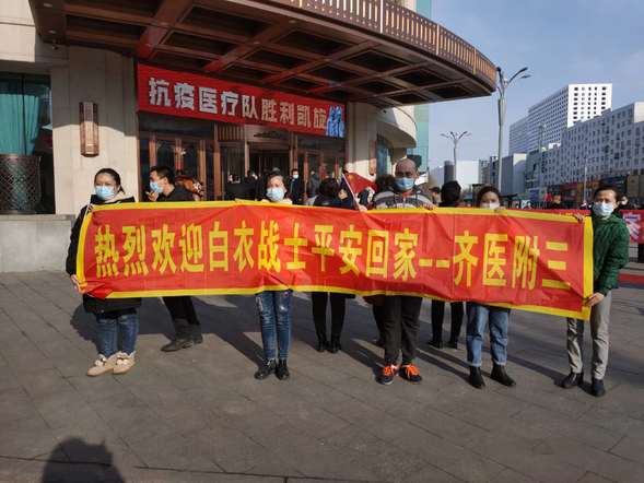 22日下午,3位队员乘坐专车回到家乡。齐齐哈尔市政府副市长刘艳芳、市卫健委副主任孔凡纯、齐齐哈尔医学院院长、党委副书记赵炜明、副院长毕红霞到齐齐哈尔市进城口迎接白衣战士们回家,齐齐哈尔医学院医管处处长张嘉伟、我院党委书记李玉雪与领导班子成员、职能部门负责人、重症监护室主任、护士长和张夺的同事们在和美酒店迎接。在迎接仪式现场,领导们为队员们献上鲜花,用这种最质朴、最亲切的仪式,表达对抗疫勇士们的崇高敬意。