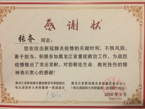 黑龙江省新冠肺炎省级重症救治中心为张夺颁发的《感谢状》